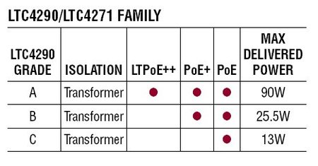 LTC4290芯片组在流行的兼容性测试中,赢得了能与 PoE+ 和 PoE 系统 100% 互操作的评分。当与 LT4275 受电设备 (PD) 控制器配对使用时,完整的端到端 LTPoE++ 系统在与 PoE+ 和 PoE 保持完全兼容的同时,还可提供高达 90W 的功率。