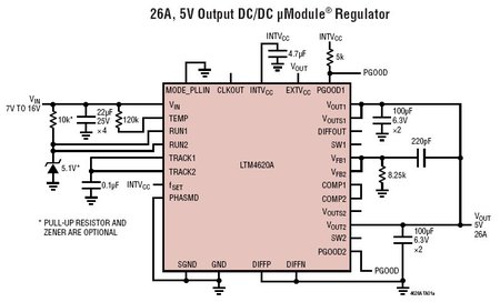 LTM4620A这款器件支持频率同步、多相操作、突发模式 (Burst Mode?) 操作以及用于电源轨排序的输出电压跟踪功能,并具有一个负责监视器件温度的内置温度二极管。高开关频率和一种电流模式架构的运用实现了针对电压和负载变化的快速瞬态响应,而并未牺牲稳定性。