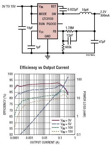 LTC3103 以固定的 1.2MHz 开关频率工作,并运用同步整流提供高达 95% 的效率。