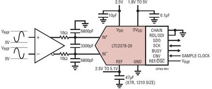 LTC2378-20 提供了一种独特的数字增益压缩 (DGC) 功能,因而免除了驱动器放大器的负电源并保持了 ADC 的完整分辨率。当被使能时,ADC 将执行一种数字定标功能,此项功能用于将零标度代码从 0V 变换至 0.1·VREF,以及将全标度代码从 VREF 变换至 0.9·VREF.对于一个 5V 的典型基准电压,全标度输入范围现为 0.5V 至 4.5V,这就为从单 5.5V 电源给驱动放大器供电提供了足够的储备空间。