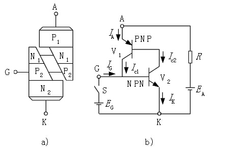 晶闸管的双晶体管模型及其工作原理 a) 双晶体管模型 b) 等效电路