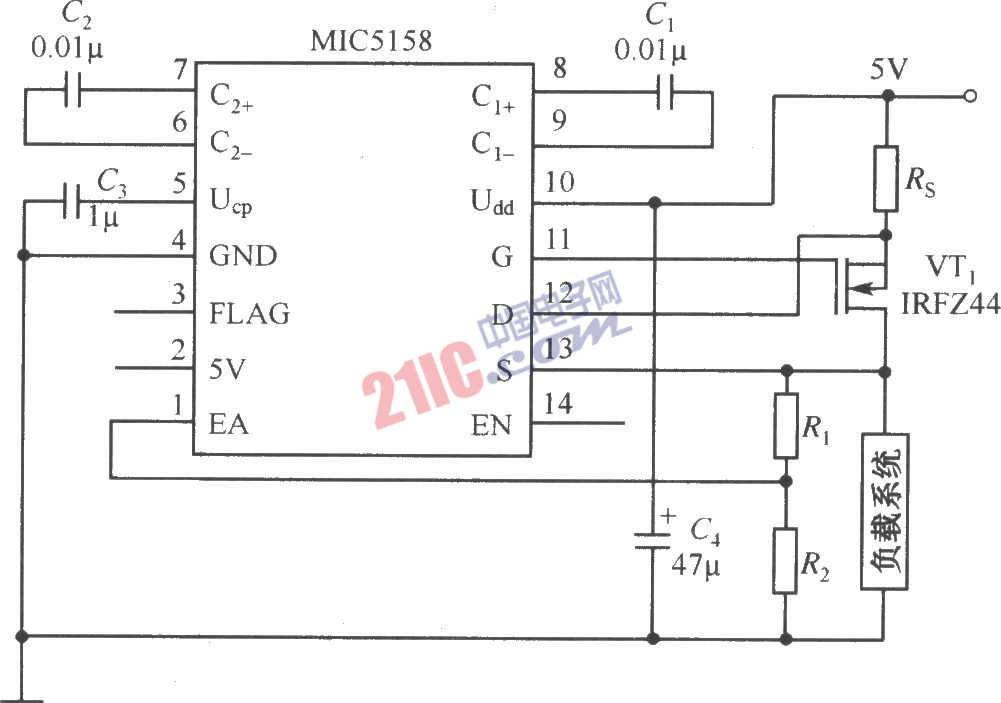 由MIC5158作为控制器的简单恒流源电路如图所示。该电路的输出电流主要取决于MIC5158内部的35mV基准电压源与外加的限流电阻Rs,其关系式为Io=35mV/Rs。