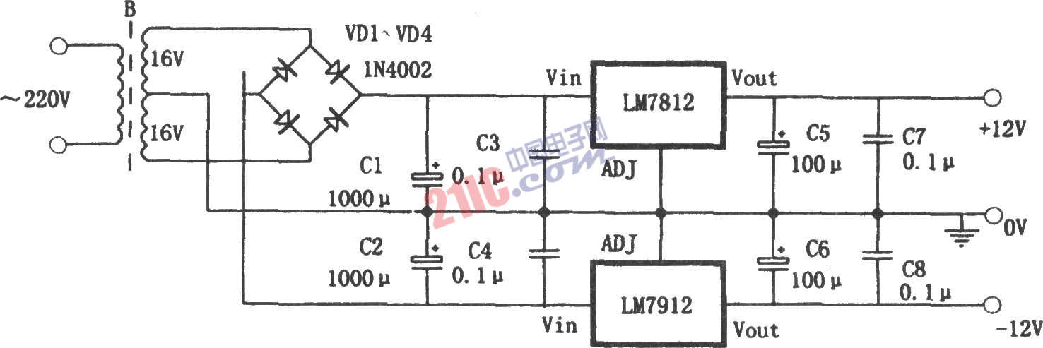 如图所示为双极性对称稳压电源电路,它采用两只三端稳压器,7812和7912构成的简单实用的对称型正负稳压电源。该电源输出电压为±12V,输出电流最大为l.5A。对7812和7912的选择,力求性能参数尽量对称。正、负三端稳压器均要加装合适的散热器。