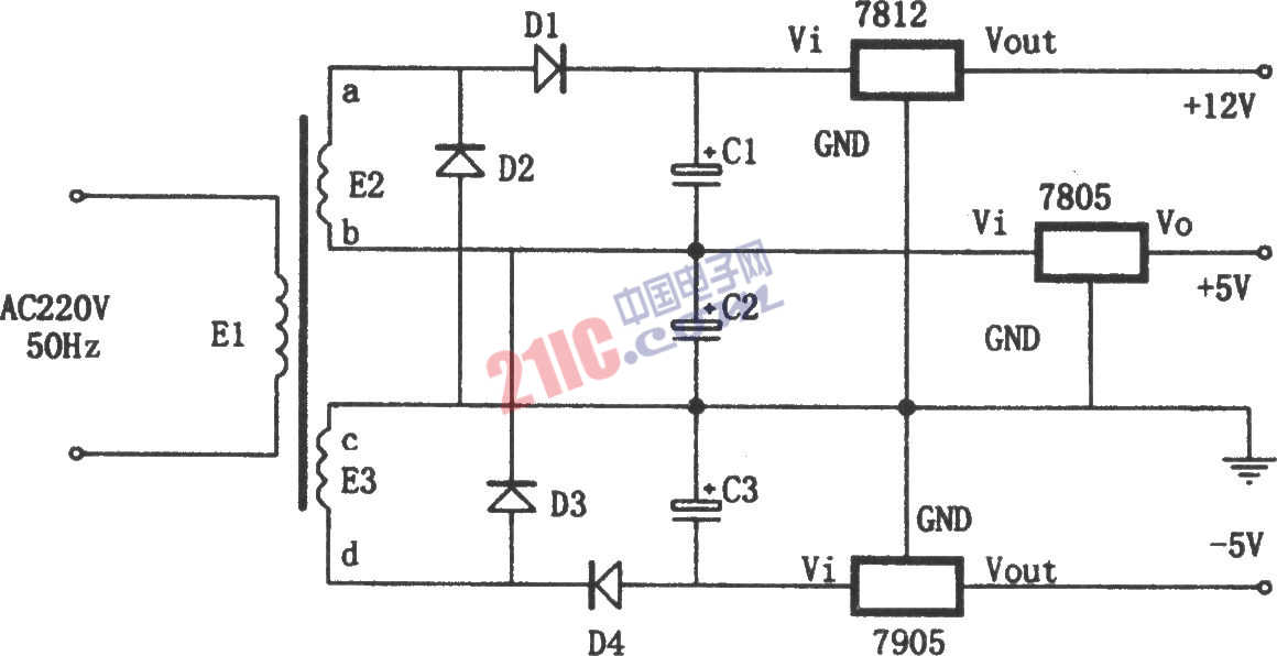 如图所示为一种特殊的电源电路。该电路虽然简单,但可以从两个相同的次级绕组中产生出三组直流电压:+5V、-5V和+12V。其特点是:D2、D3跨接在E2、E3这两组交流电源之间,起着全波整流的作用。