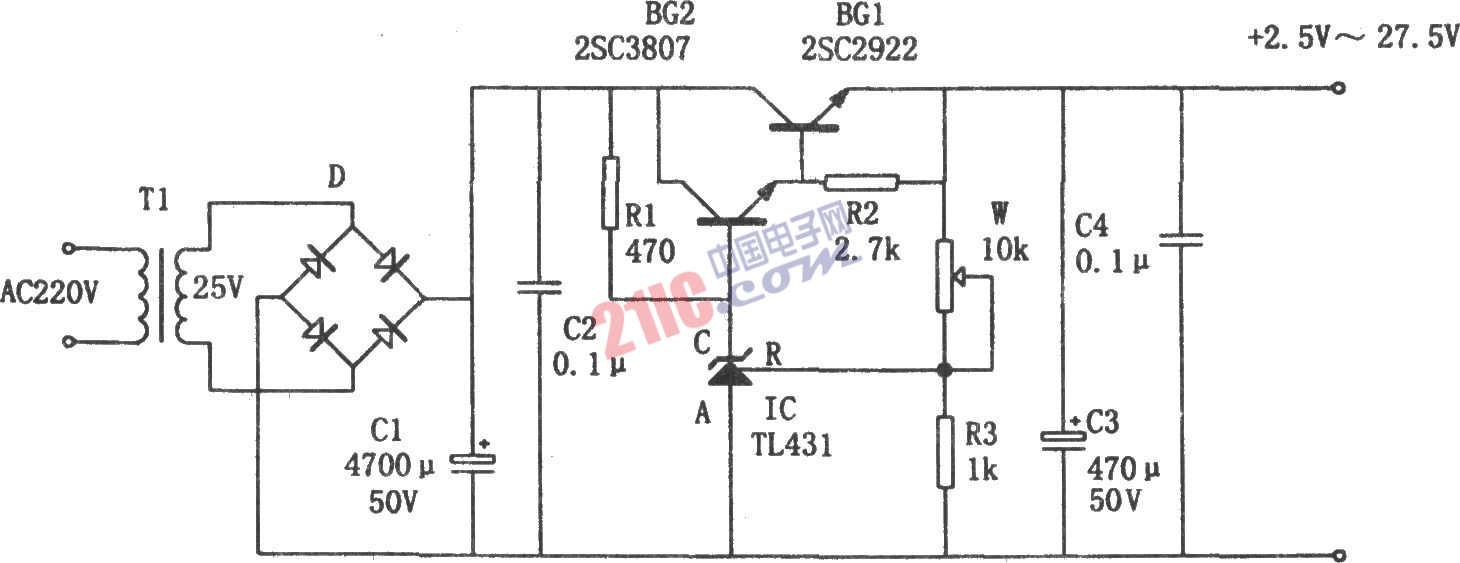 如图所示为一实用的高精度可调电源电路。该电路以具有温度补偿特性的、高精度的标准电压源集成电路TL431为核心,配合复合调整管BG1、BG2等元件构成稳压电源,输出电压在2.5~27.5V之间连续可调,输出电流≥5A,电压纹波≤5mV。