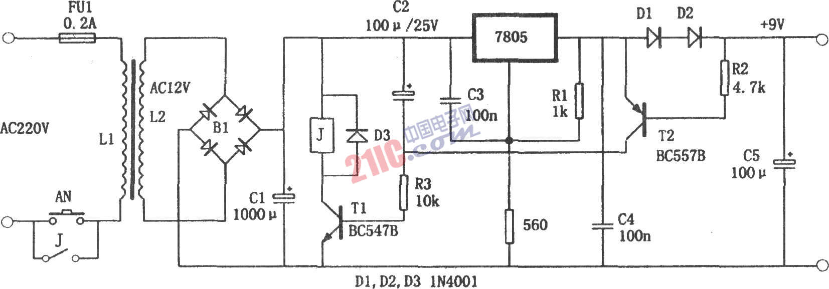 如图所示为一种在无负载电流时可自动切断的电源电路。当按下常开按钮AN后,220V交流电压加在变压器的初级绕组上,经变压、整流、滤波和7805的稳压为负载提供电压和电流。在负载上有电流通过时,D1、D2上的电位差,可使T2导通,进而T1也导通,继电器(J)动作,其触点(J1)闭合,形成自保持状态,电源正常工作。一旦负载电流停止流动(空载状态),D1、D2两端无电压,T2截止,此时C2通过T1的基极被充电,经过几秒后,T1截止,继电器释放,J1触点切断变压器初级绕组上的220V交流输入电压,稳压器停止工作。只有再接上负载,按一下AN,电源才能再次工作。