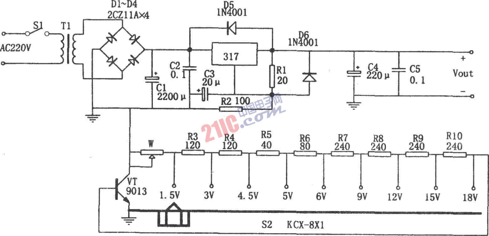 如图所示为分挡可调直流稳压电源。本电源主要以可调式三端稳压器LM317为核心,在LM317的调整端接有可调电位器W、电阻R3~R10及九挡拨动开关S2和三极管VT,通过调节S2,在输出端可得到固定的9挡不同的输出电压。三极管VT的作用是防止S2在拨动中出现暂时断开或接触不良,导致输出电压过高而损坏负载。R3~R10的阻值仅供参考。