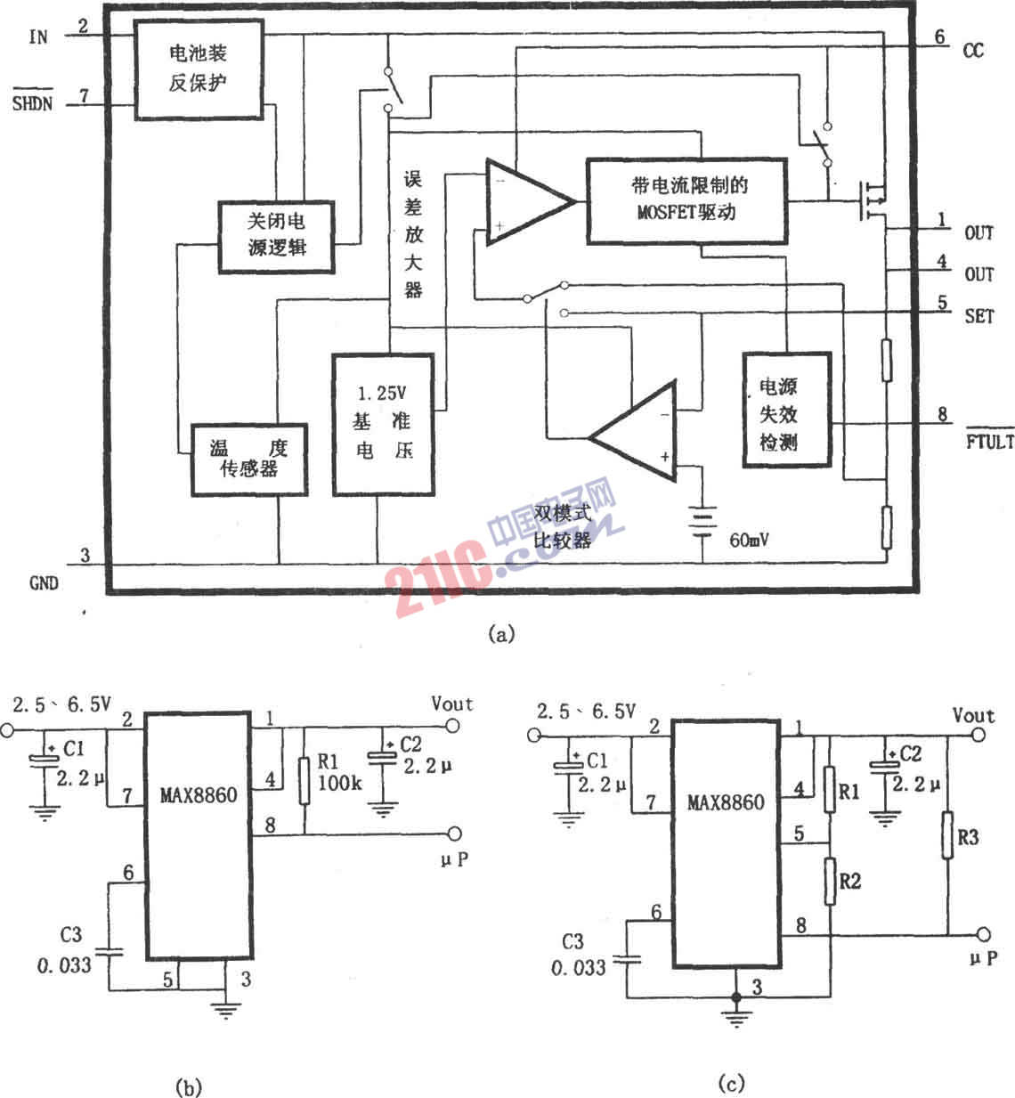 MAX8860的内部结构、管脚排列如图(a)所示。它由1.25V基准电压源,误差放大器,MOSFET驱动器、P沟道MOSFET调整管、双模式电压比较器、电源失效检测器及内部反馈的电压分压器组成。