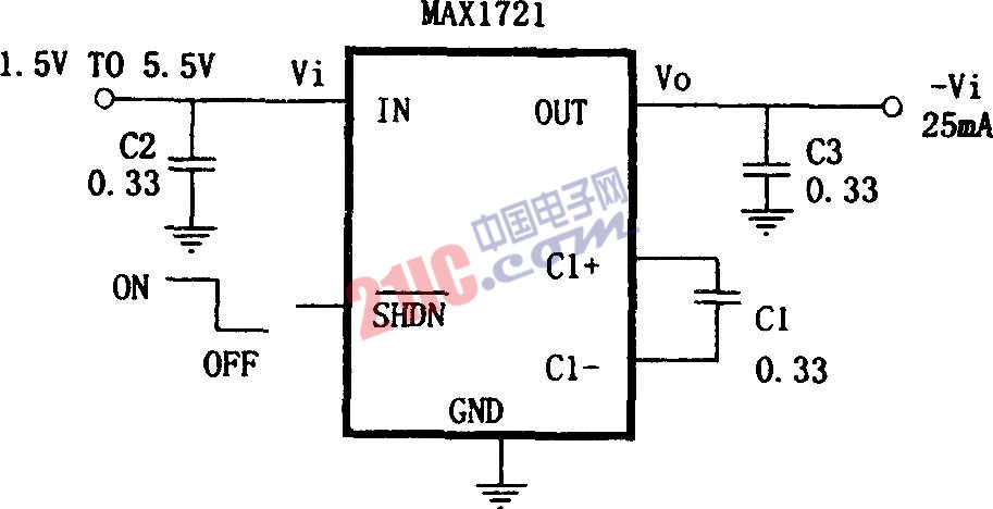 如图所示为采用微型(SOT23封装)反相电荷泵集成电路MAX1721构成的微型极性反转电源。本电路只需在MAX1721的外部接一只0.33μF的小容量、小尺寸的电容器,就可完成极性反转,即输出电压Vo=-Vi。