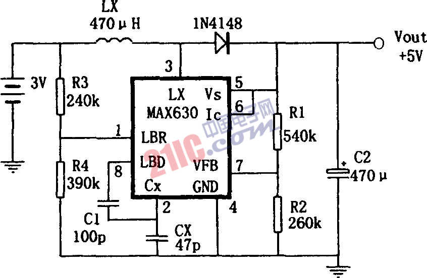 如图是利用MAX630的低电池电压检测功能构成的低电压频率偏移升压变换电源。其特点是当电池电压低于标称值(3V)很多时(降到2V),仍能在输出端高效率(85%)地提供40mA,5V的直流电压。其过程是电池电压的下降,引起MAX630 1脚电压(由R3和R4对电池电压分压而得到)也下降,当下降到低于电池电压检测比较器的门限电压(1.31V)时,检测输出端(⑧脚)LBD变为低电平(地电位),将C1与Cx并接在一起,从而降低MAX630内部振荡器的频率。增加输出功率,补偿因电池电压降低而输出功率的不足,保持输出功率不变。
