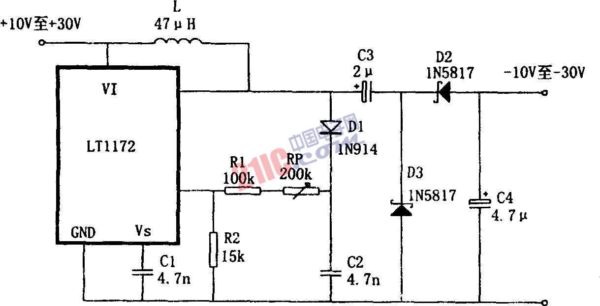 如图所示为一种由升压型开关稳压器 LT1172构成的极性反转型升压电源。该电源输出电压为-10~-30V,输出电流为25mA,变换效率为80%。它利用LT1172进行升压,并在LT1172的输出端接C1、C2、D2、D3所组成的“电荷泵”完成输出电压的极性变换。