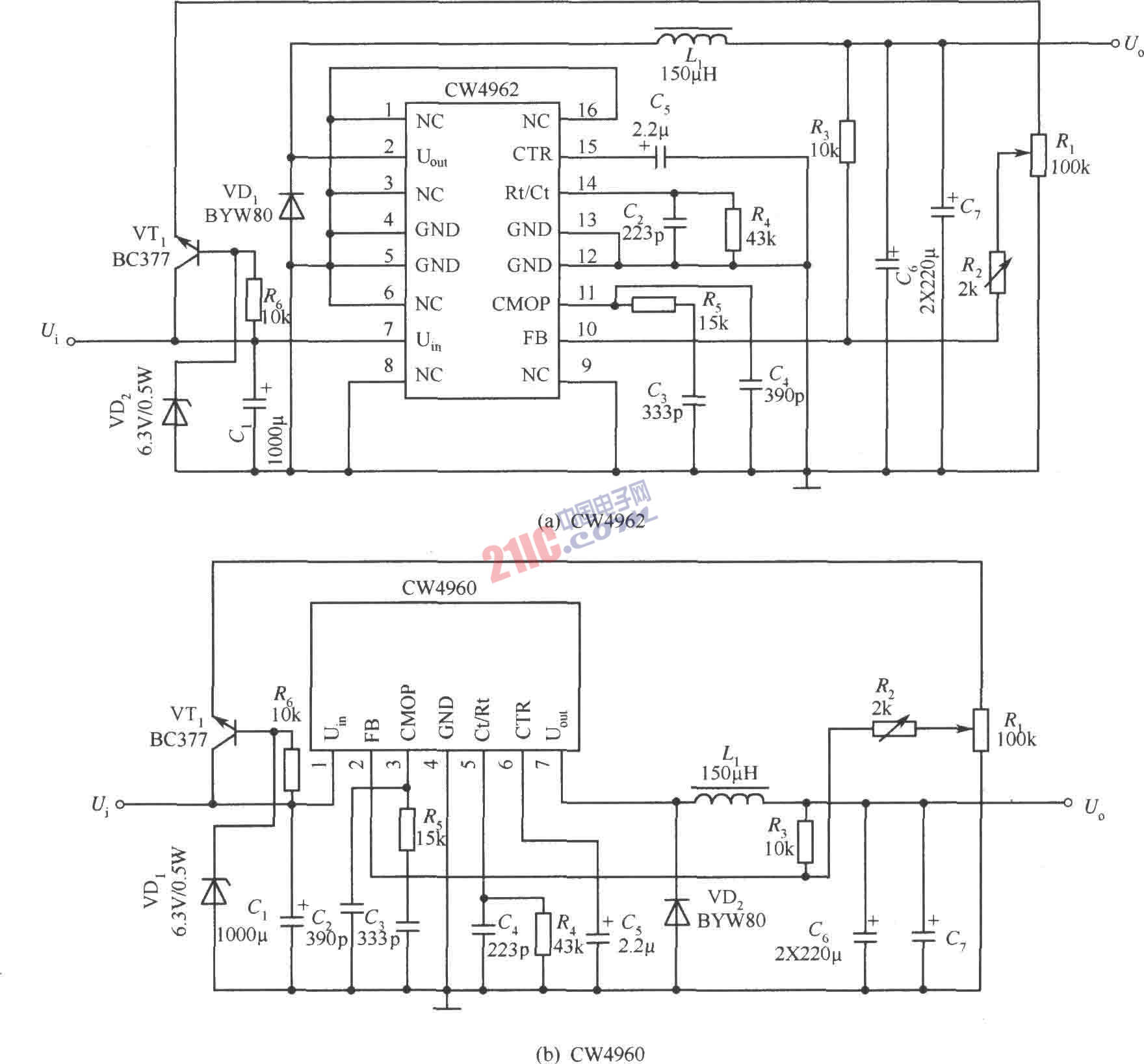 采用如图所示的电路可以获得0~30V连续可调的直流稳压电源。这时,可调电阻Rl再接一个可调电阻R2。0~6V由Rl来调节,调节R2可获得Uref~30V的连续输出电压。让取样10kΩ电阻设计流过2.5mA电流,减小R2并增大R1时,流过10kΩ电阻的电流减小。这时Uo也降低,其内电流为零时,Uo=Uref。Rl上电压超过Uref时,10kΩ电阻中的电流开始反向,Uo则开始低于5V,而10kΩ电阻上压降为Uref时,Uo=0V。