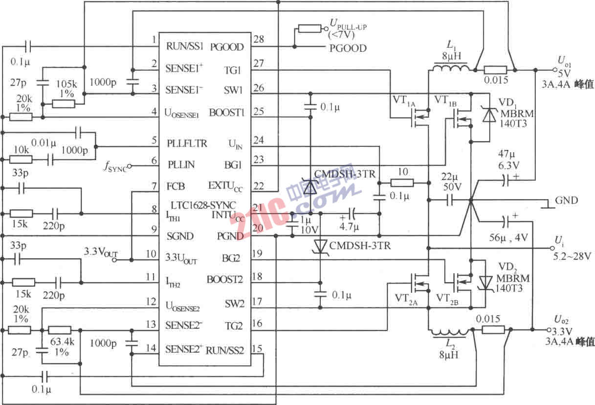 开关频率=300kHz;VT1,VT2:FDS8936A;Ll,L2:8μHSUMIDACEP1238ROMC;输出电容:PANASONIC SP系列。