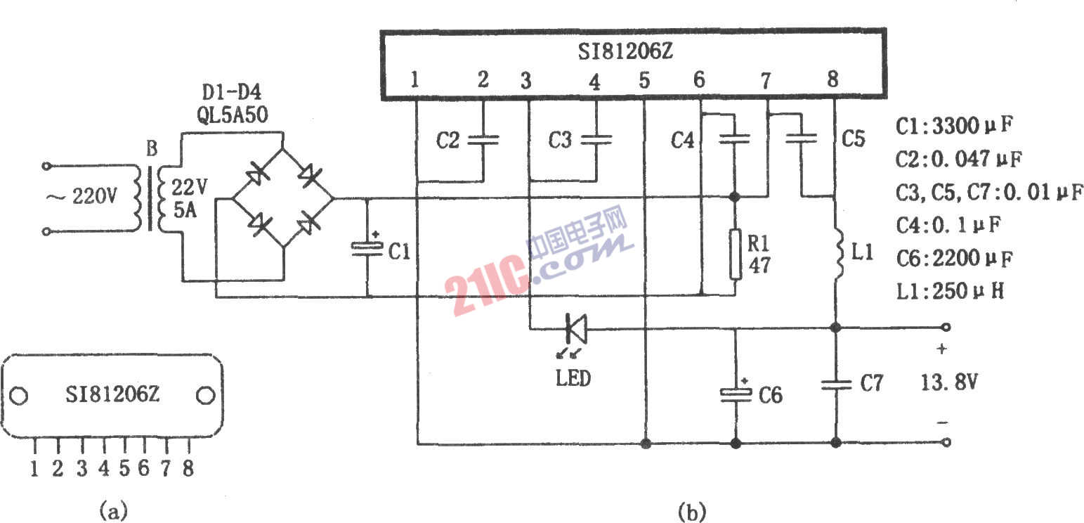 如图所示为采用SI81206Z模块构成的13.8V开关稳压电源。该13.8V电源用于基地台、车载台等电子仪器上,具有效率高、结构简单、性能可靠等特点。