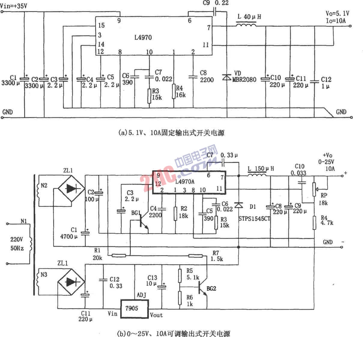 如图所示为由L4970A构成的大功率开关电源。L4970A是一种大功率单片开关集成稳压器,该芯片采用SIP-15封装,其特点是;(1)输入电压必须>11V,一般为15~40V之间;(2)输出电压:固定输出5.1V,也可通过外部电路设置成可调输出,范围在5.1~40V;(3)最大输出电流为10A;(4)工作频率200kHz;(5)内部设有欠压检测、掉电复位、功率级软启动等特殊电路。