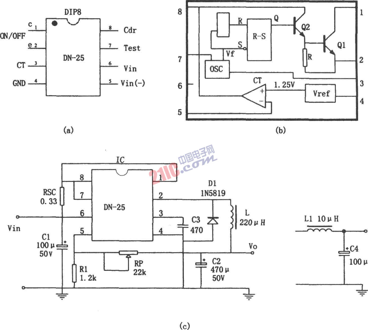 如图所示为由DN-25集成电路的开关稳压电源。DN-25是单片开关型稳压电源器件,适合制作中等输出电流、宽调压范围的稳压电源。它的主要性能指标如下:输入电压VIN=3~40V,输出电压Vo=1.25~24V(连续可调),最大输出电流IOM=1A,最大输出功率POM=36W,负载短路限制电流IOSH≤1.1A。DN-25采用8脚双排直插式封装(DIP-8),其内部电路主要包括:(1)振荡器(OSC);(2)R-S触发器;(3)输出开关;(4)电压基准(VREF=1.25V)和比较器。DN-25内部振荡器的振荡频率f由③脚所接入的定时电容CT决定,f=1/CT。