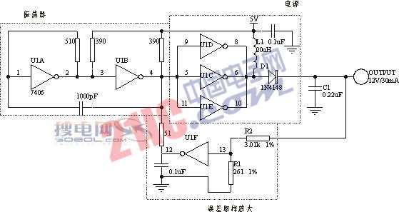 如图所示的电路用一个TTL六反相器即可构成一个DC/DC变换器,将5V变成12V。该电路提供了DC/DC变换所需的所有功能。