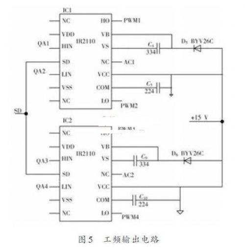 DC/AC变换输出电路采用全桥逆变单相输出,其驱动输入波形则由单片机输出信号驱动半桥驱动器IR2110 输出工频驱动信号,通过单片机编程可调节该输出驱动波形的D<50%,保证逆变的驱动方波有共同的死区时间.如图5 所示,QA1~QA4 端分别接到单片机的PB1~PB4 引脚,由此引脚输出信号驱动两片IR2110,分别从PWM1~PWM4输出50 Hz的工频信号去驱动桥式逆变电路产生正弦波形。