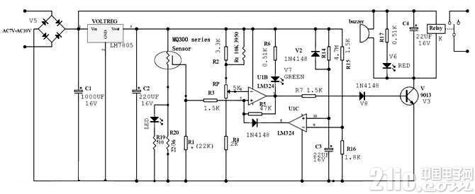 一个简单的酒后驾车自动保护系统图,利用酒精传感器的含有酒精气体检测装置,当在车内检测到酒精浓度超过标准,电路中继电器动作,切断汽车发动机,使汽车不能开动。如图5, 此电路控制简单,缺点只要车内酒精浓度超标则会动作,所以应用存在局限性,如出租车就不适合。