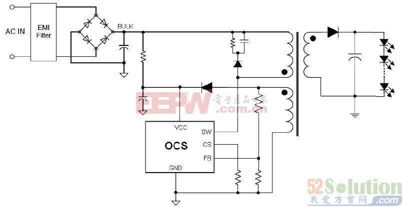 OCP8155 具备完善的保护功能,其利用VCC 脚进行过压检测,一旦检测到过压信号芯片便进入打嗝工作状态;芯片利用FB 管脚实现了短路检测,一旦发现短路信号芯片便会进入较低的工作频率以限制输出功率,同时芯片还具备LED 开短路保护、FB 短路保护、欠压锁定和过温保护功能以保证整个系统在恶劣的工作环境中安全可靠的工作。