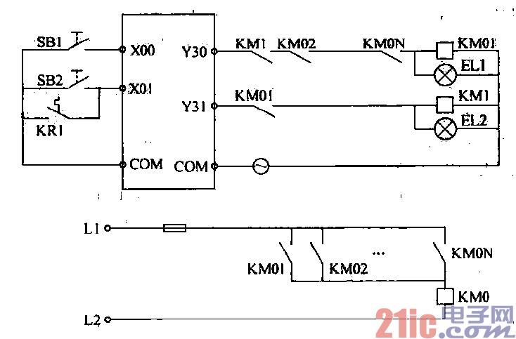 在电动机PLC控制回路的硬件设计中,要求实现硬件的联锁控制t以保证设备舶奉全.为了说明PLC 控制回路的设计方法,以电动机Ml的起动为例,给出如图