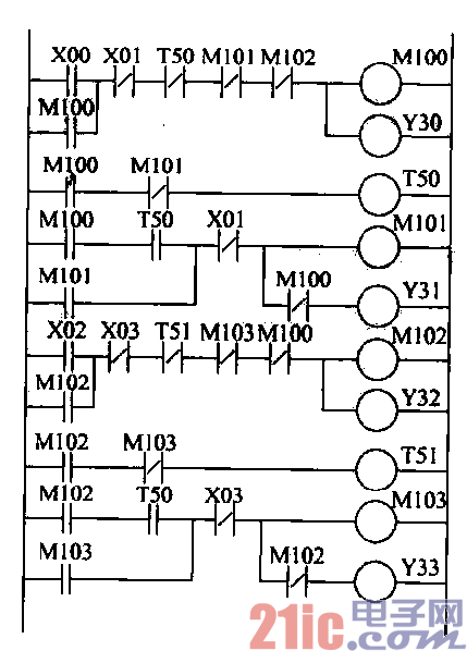 Y30线圈回路中串入M102常闭触点,以及Y32线圈回路中串人Ml00常闭触点,是从软件上使两台
