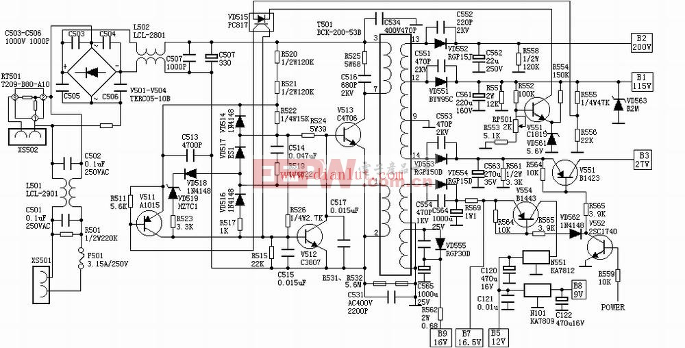V553及周边元件、VD515、V511、V512组成稳压控制电路。R552为取样电阻,VD561为V553的发射极提供基准电压,当电源输出电压过高时,V553、VD515、V511、V512均导通程度增加,使开关管V513的基极被分流,输出电压随之下降;反之,若电源输出电压降低时,V553、VD515、V511、V512均导通程度减少,使开关管V513的基极分流减少,输出电压随之上升。
