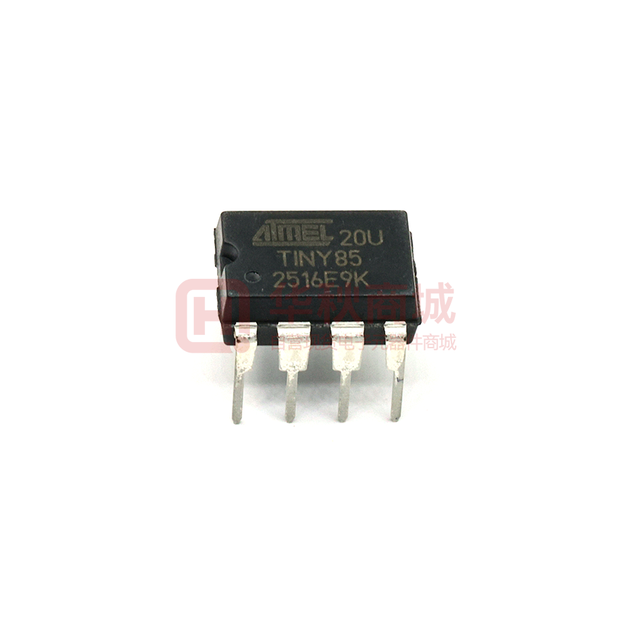 Microchip AVR tiny85 的工作电压为 2.7 - 5.5 V,提供六个通用 I/O、一个 4 通道 10 位 A/D 转换器、两个 8 位定时器、中断(内部和外部),而且该器件通过在单时钟周期内执行功能强大的指令,实现了 20 MHz 下的 20 MIPS 性能。 凭借丰富的可编程存储器(8 KB 闪存、512 B SRAM 和 512 B EEPROM)、三种可通过软件选择的节电模式、内部振荡器、用于片载调试的 debugWIRE,这款 8 引脚器件成为节省空间型 MCU 的绝佳选择。