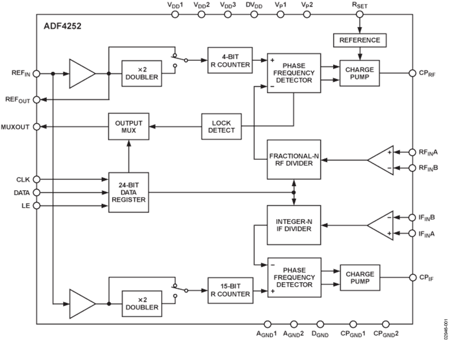 ADF4252是一款双通道小数N/整数N分频频率合成器,可以用来在无线接收机和发射机的上变频和下变频部分实现本振(LO), 射频和中频频率合成器由低噪声数字鉴频鉴相器(PFD)、精密电荷泵和可编程参考分频器组成。 射频频率合成器内置一个Σ-Δ型小数插值器,能够实现可编程小数N分频。 中频频率合成器拥有可编程整数N计数器。 如果频率合成器与一个外部环路滤波器和电压控制振荡器(VCO)一起使用,则可以实现完整的锁相环(PLL)。所有片内寄存器均通过简单的三线式接口进行控制。 该器件采用2.7 V至3.3 V电源供电,不用时可以关断。