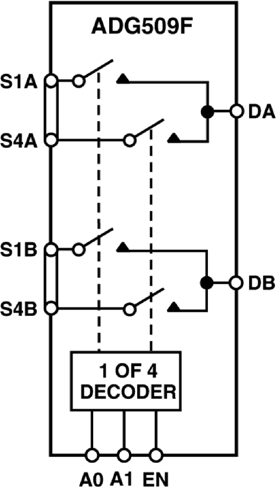 ADG1439: ±15 V/+12 V/±5 V, Dual 4 to 1 Multiplexer, Serially Controlled Matrix Switch The ADG1438 and ADG1439 are CMOS analog matrix switches with a serially controlled 3-wire interface. The ADG1438 is an 8-channe