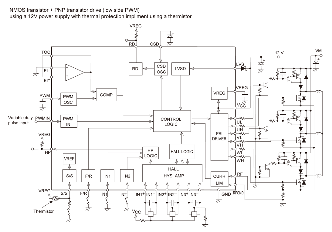 LB11696V is a direct PWM drive brushless motor predriver IC designed for 3-phase power brushless motors. A motor driver circuit with the desired output power (voltage and current) can be implemented by adding discrete transistors in the output circuits. Furthermore, the LB11696V provides a full complement of protection circuits allowing it to easily implement high reliability drive circuits. This device is optimal for driving all types of large scale motors, such as those used in air conditioners and on-demand water heaters.