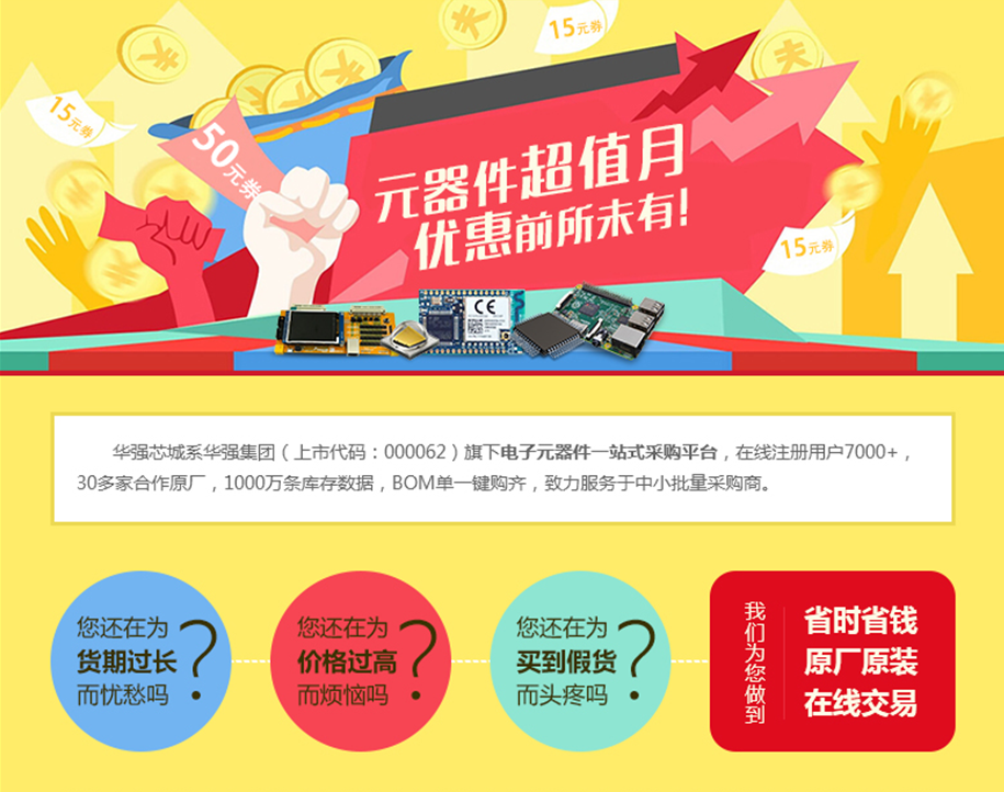 为回馈广大会员,5月22日---5月31日,华强芯城全场满3000即送50元现金券!!数量有限!!!先到先得!!!