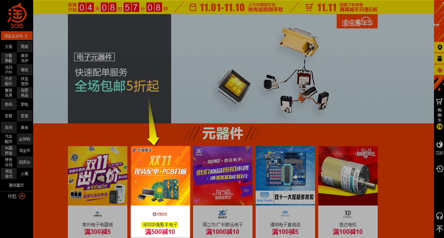 2015年,华强芯城与淘宝官方合作,推出双十一淘宝特别活动,在开辟新的业务的同时,也开启元器件行业与淘宝官方合作的首例。