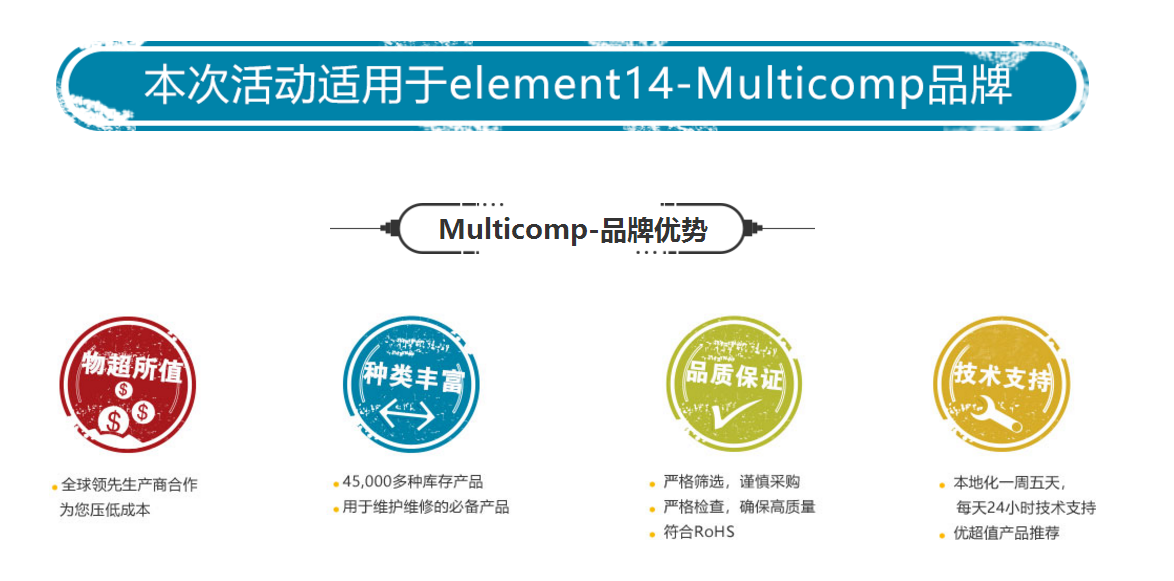 1、Element14-Multicomp货源品牌满3000RMB即可享受9折优惠,活动期间订单均有效,不可与其他代金券叠加使用;