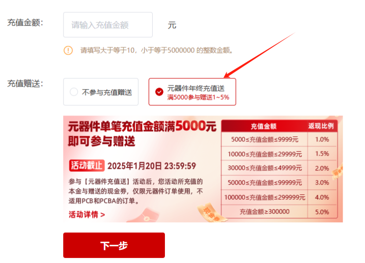2)参加元器件充值送活动,必须要勾选"元器件年终充值送"选项,才可赠送相应的比例的现金券;