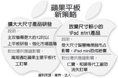 市场传出,苹果明年平板策略将大转弯,不再推出7.9寸 的 ipadmini系列产品,集中火力拱12寸以上的新款大平板,最快明年3月问世,全数由鸿海代工,原本靠代工ipadmini,成为苹果供应链的仁宝、和硕恐痛失订单。