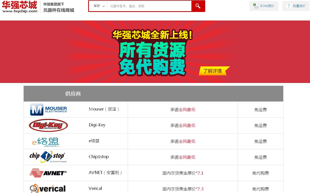 华强芯城获得母公司华强集团资源支持,同时还与国际大型分销商Digikey、Mouser、Avnet、Future、Element14等有良好的合作关系,产品库存数量超千万。芯城全新上线,不仅货源有保证,还免去所有代购费。